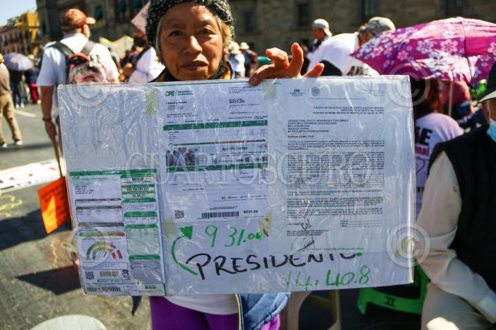Ex trabajadores del SME y ciudadanos se manifiestan frente a Palacio Nacional por las altas tarifas de la Luz.