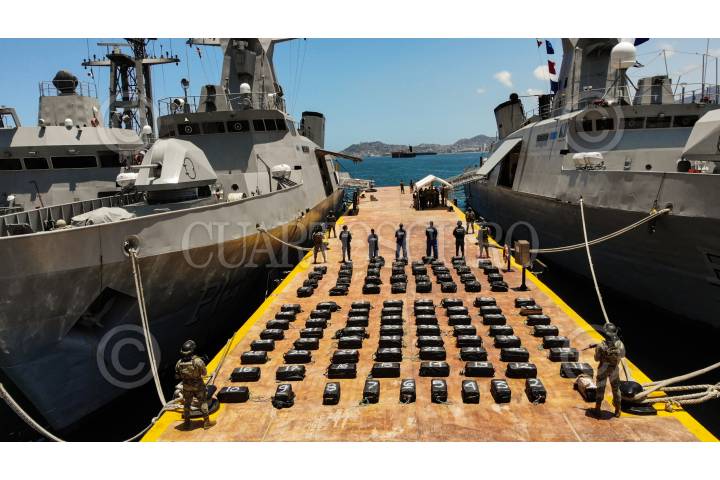 CIUDAD DE MÉXICO 28AGOSTO2023.- La Secretaría de Marina a través de la Armada de México, informa que, en días pasados, personal de esta Institución, aseguró, en dos acciones diferentes, tres embarcaciones con aproximadamente 4,400 (cuatro mil cuatrocientos) kilogramos de presunta cocaína, aproximadamente 5,300 (cinco mil trescientos) litros de combustible y logró la detención de 11 presuntos trasgresores de la ley, frente a costas del Pacífico mexicano. Cabe destacar que durante el presente mes se han asegurado un aproximado de 11,400 (once mil cuatrocientos) kilogramos de presunta cocaína, así como la detención de 23 presuntos trasgresores de la ley, de los cuales 18 son de nacionalidad mexicana. FOTO: SEMAR/CUARTOSCURO.COM