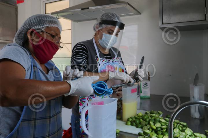 Dos mujeres preparan agua para el comedor móvil para personas vulnerables y familiares