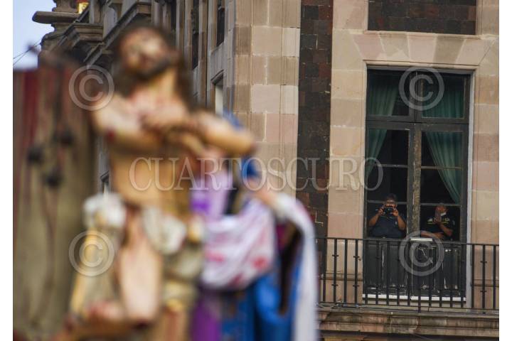 Dos mujeres observan desde una de las ventanas de Ayuntamiento de Toluca el paso de la Procesión del Silencio y la Esperanza después de dos años pospuesta por la pandemia de COVID-19, 25 cofradías de la Arquidiócesis de Toluca participaron en este acto de fe.