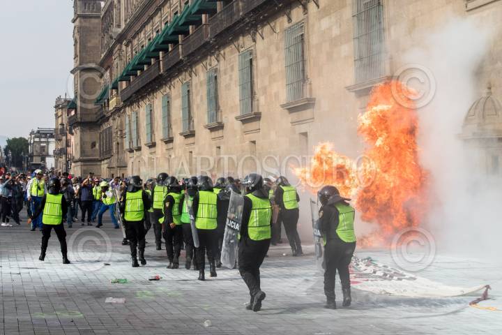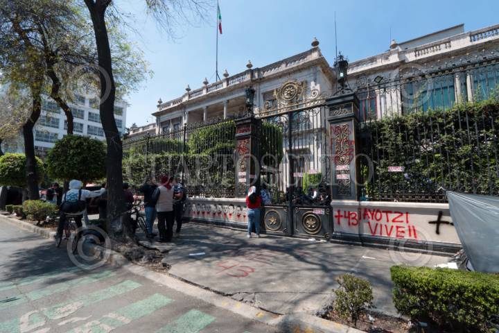 CIUDAD DE MÉXICO, 27FEBRERO2024.- Normalistas de Ayotzinapa, Guerrero lanzaron cohetones y realizaron pintas a las instalaciones de la secretaría de Gobernación (Segob) a modo de protesta y en exigencia de la aparición con vida de los 43 normalistas de la Normal Rural Raúl Isidro Burgos. Lo anterior, en el marco de la 9na jornada de lucha por la desaparición de los jóvenes. FOTO: ROGELIO MORALES/CUARTOSCURO.COM