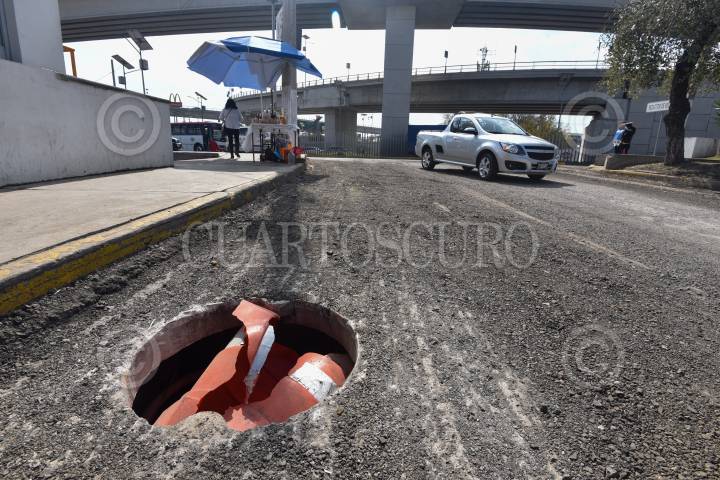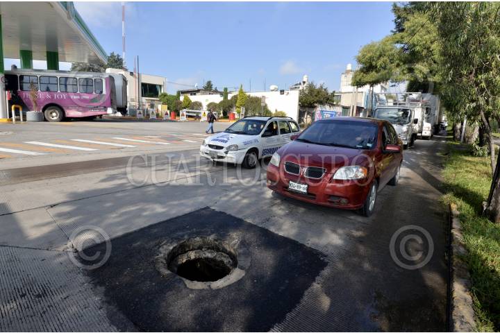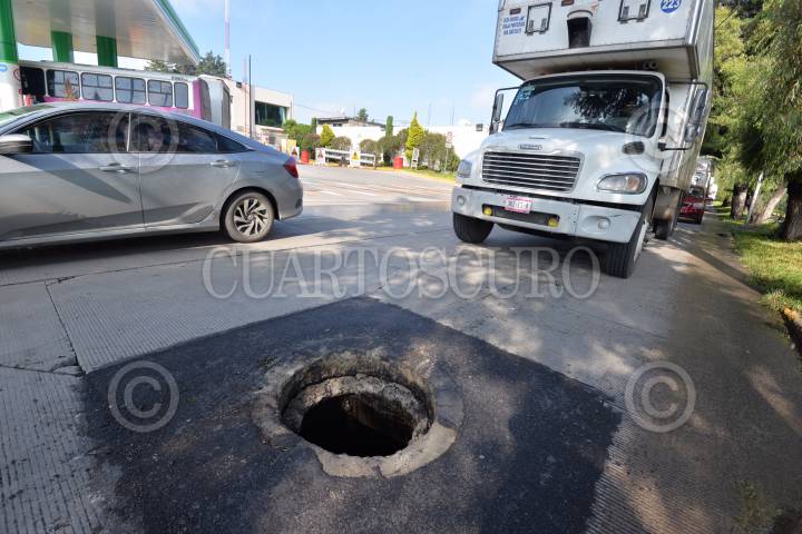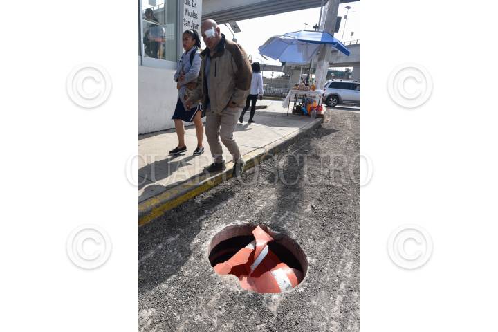 SAN MATEO ATENCO, ESTADO DE MÉXICO, 13JULIO2018.- El robó de tapas de coladeras en el Valle de Toluca es recurrente, tal es el caso de Paseo Tollocanen carriles de baja velocidad en donde los automovilistas tienen que manejar con extrema precaución para no caer en las coladeras abiertas. FOTO: ARTEMIO GUERRA BAZ /CUARTOSCURO.COM