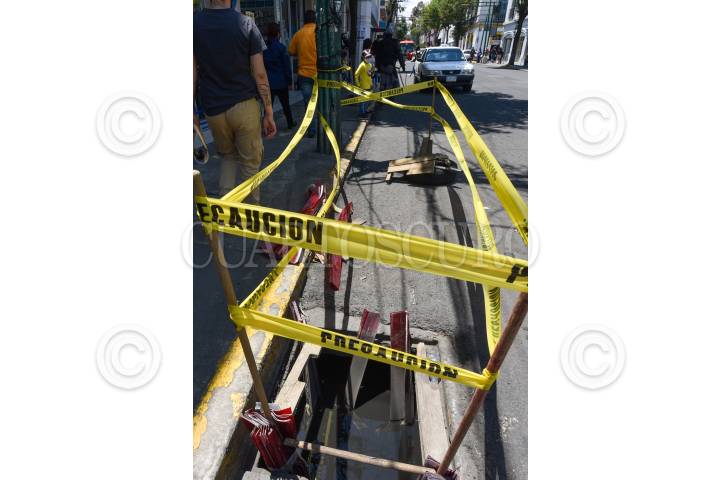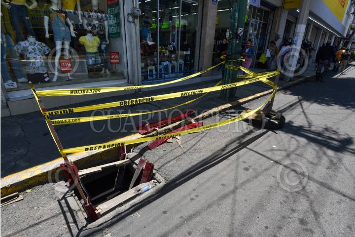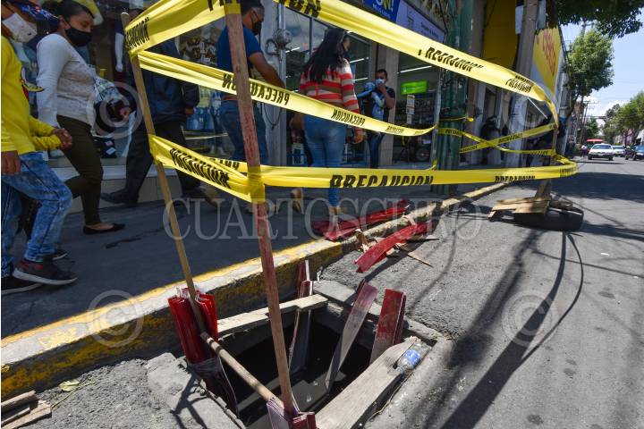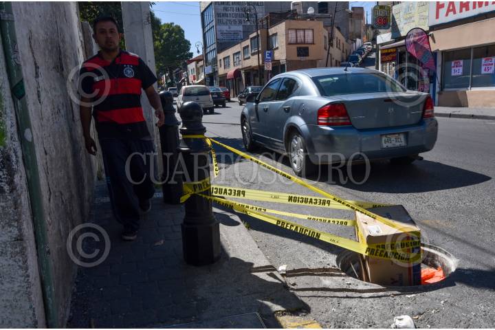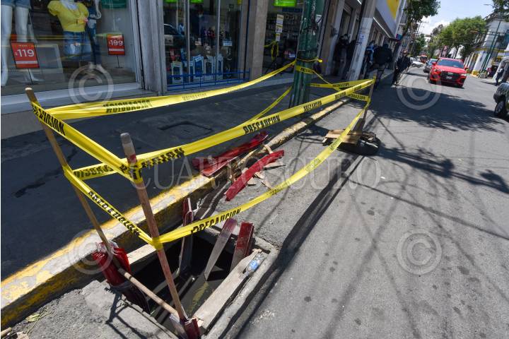 Ante el peligro que representa esta coladera abierta en la avenida Independencia en la ciudad de Toluca colocaron cinta amarilla para que se vista por los peatones.