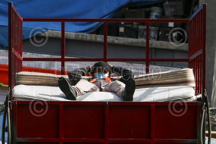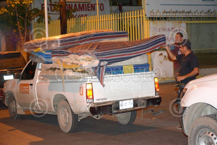 Hombre toma descanso, arriba de colchones apilados que se transportan en una camioneta. FOTO: ROGELIO MORALES /CUARTOSCURO.COM
