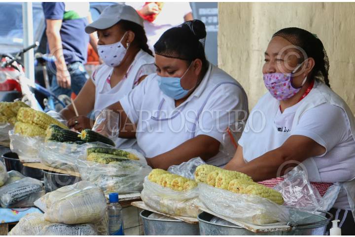 Un grupo de mujeres venden elotes a las afueras del mercado de Xochimilco, implementando medidas sanitarias recomendadas. FOTO: ROGELIO MORALES /CUARTOSCURO.COM