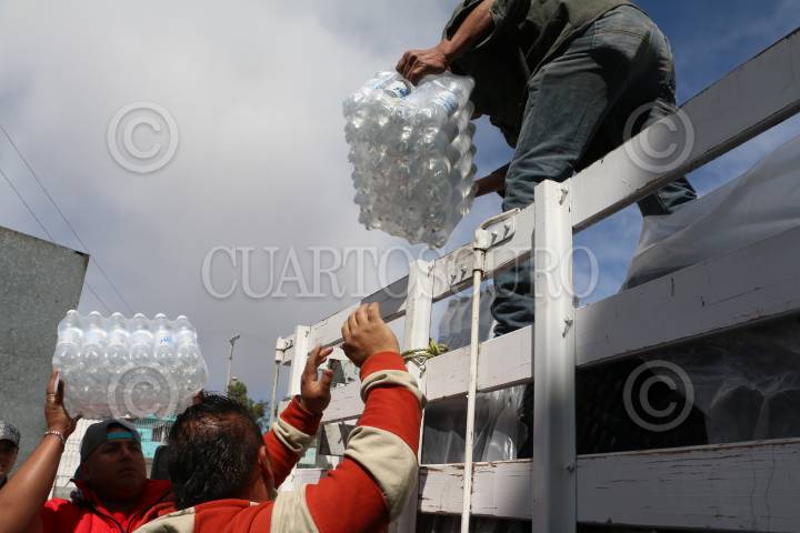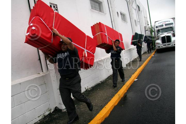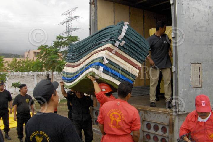 CHILPANCINGO,GUERRERO.-06OCTUBRE2005.- Personal de protección civil del estado y elementos de la policía, descargan las colchonetas que serán enviadas a los damnificados por las fuertes lluvias registradas en las dos costas del estado de Guerrero. Foto: Oscar Alvarado/CUARTOSCURO.COM