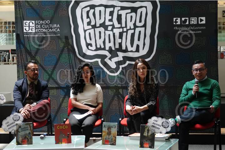 Alex Herrerías, Erendira Guzmán, Susana Figueroa y Horacio de la Rosa durante la presentación de la nueva colección de cómic infantil "Espectrográfica".