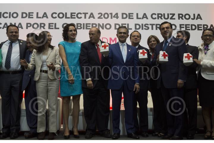 MÉXICO, DF., 28MARZO2014.- Miguel Ángel Mancera, jefe de gobierno capitalino, arrancó oficialmente la Colecta Nacional 2014 Cruz Roja Mexicana. Fernando Suinaga, director de la Cruz Roja Mexicana, acompañado de Armando Ahued Ortega, secretario de salud del DF., detalló que actualmente se cuenta con el servicio de 30 mil unidades ambulancias en toda la ciudad y que el 96 por ciento de lo acumulado en la colecta será lo destinado para los ciudadanos que padezcan cualquier tipo de emergencia; el otro 4 por ciento será utilizado en cuestiones administrativas. El jefe de gobierno instó a los elementos de su gabinete y a los 16 delegados para que realizaran su aportación de 500 pesos cada uno. FOTO: MARÍA JOSÉ MARTÍNEZ /CUARTOSCURO.COM