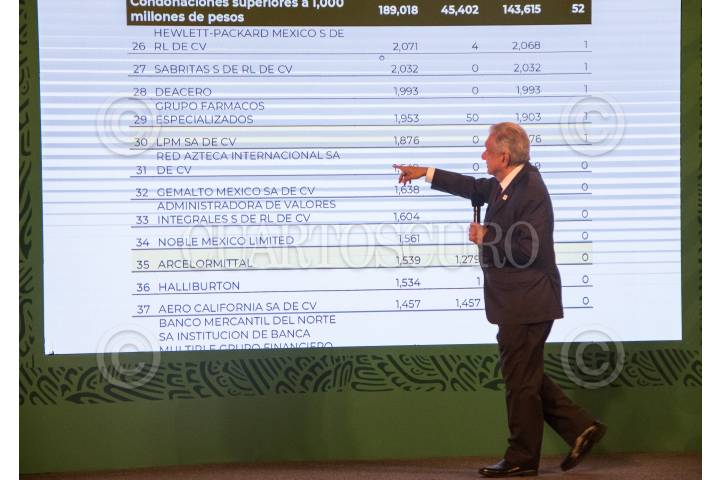 Andrés Manuel López Obrador muestra una tabla con las aproximaciones de crecimiento económico durante la conferencia matutina en Palacio Nacional