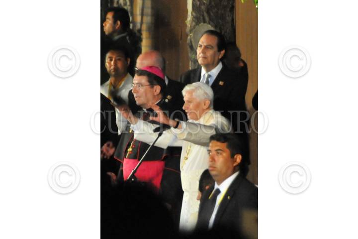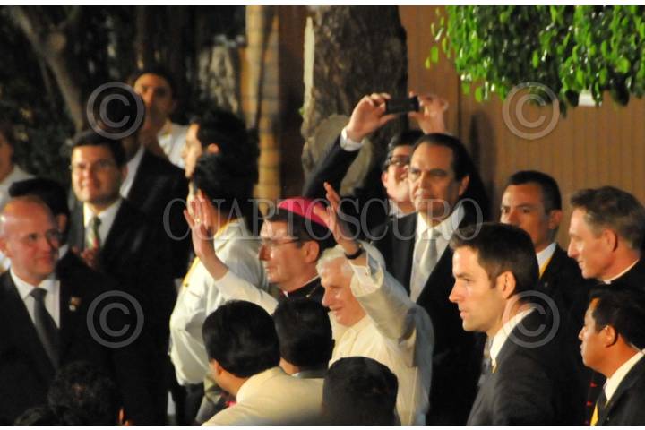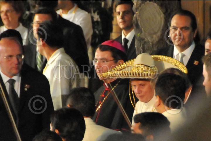 LEÓN, GUANAJUATO, 25MARZO2012.- El Papa Benedicto XVI fue agasajado con mariachis a las puertas de la casa en donde descanso en la ciudad. El Santo Padre se despidió de los feligreses que estuvieron acompañándole en todo su viaje por el estado. El sumo pontífice salió del Colegio Miraflores después de varias canciones que le brindo un conjunto musical. FOTO: IVÁN MENDEZ /CUARTOSCURO.COM