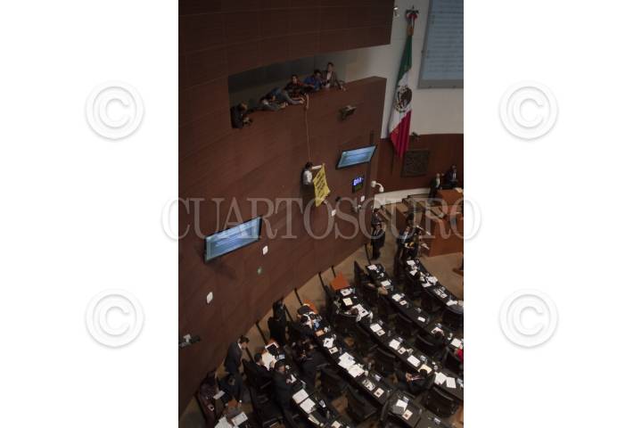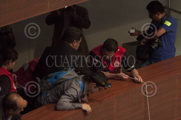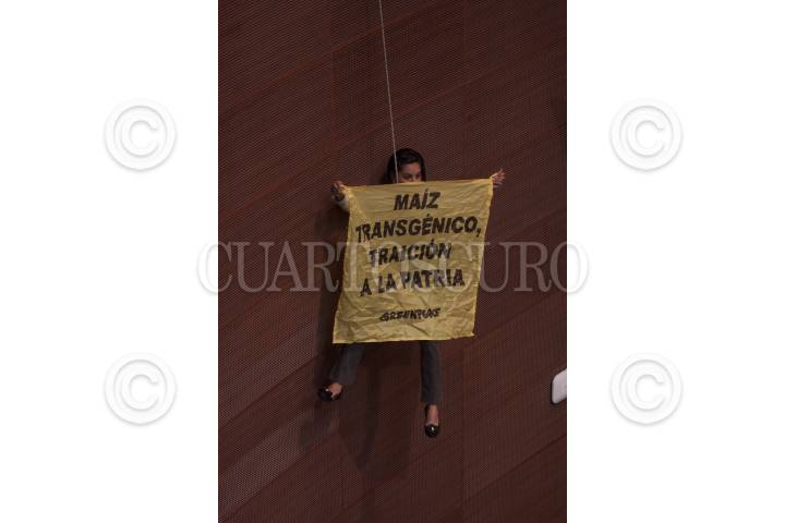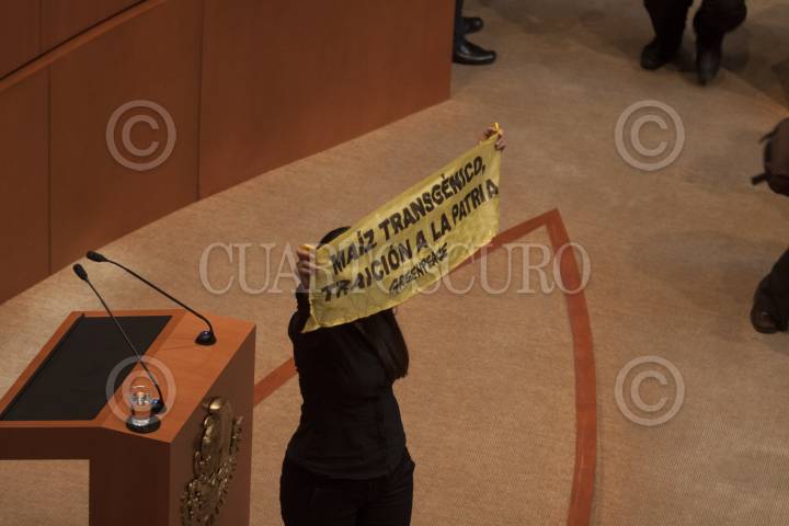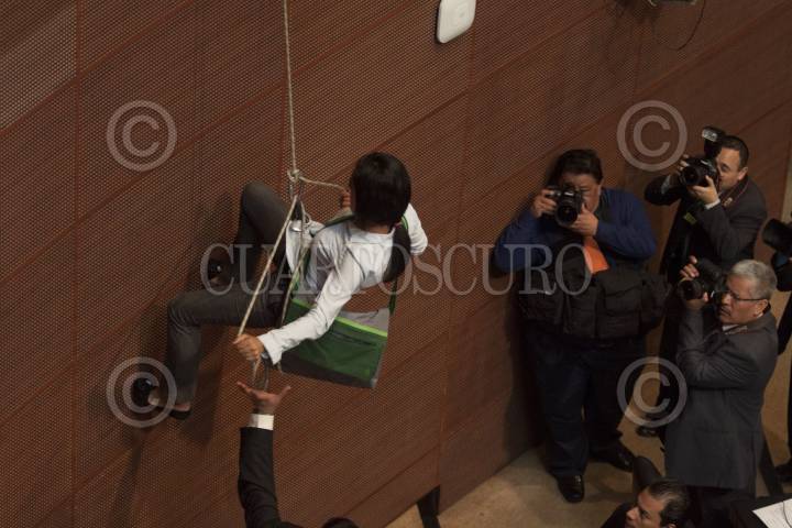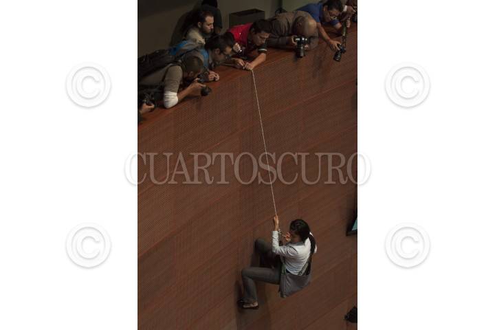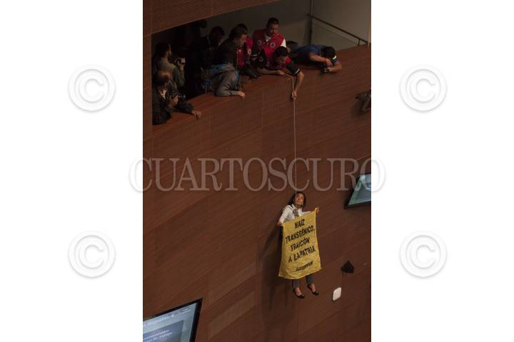 MÉXICO, D.F., 25ABRIL2013.- Una activista de Greenpeace se descolgó de uno de los palcos de prensa del Senado, ya colgada desplegó una manta con la leyenda "Maíz Transgénico, Traición a la Patria", personal de seguridad intentó impedir esta manifestación pacifica jaloneando a la persona que sostenía a la activista, tras unos minutos en los aires la mujer se descolgó a la sala, senadores del PAN como Mariana Gómez del Campo mostró su inconformidad por esta demostración. FOTO: MOISÉS PABLO /CUARTOSCURO.COM