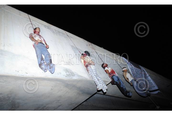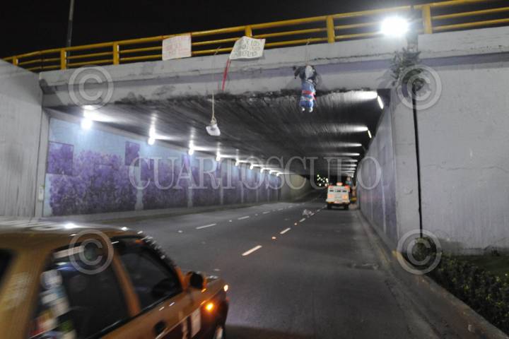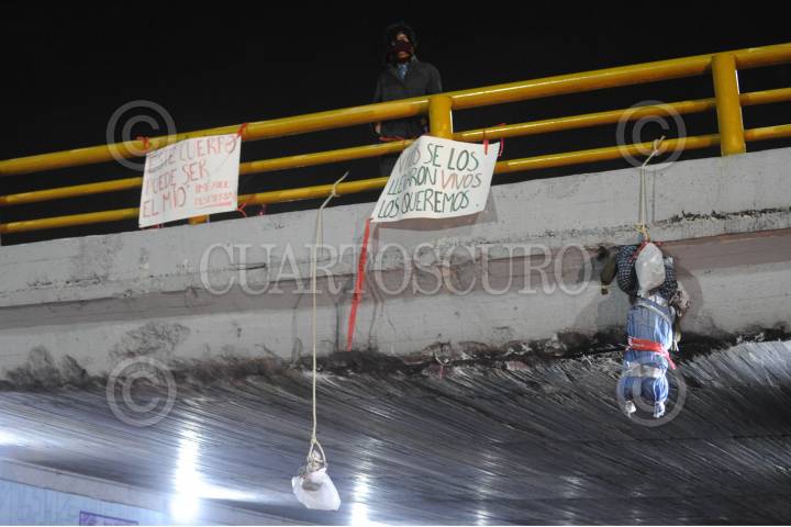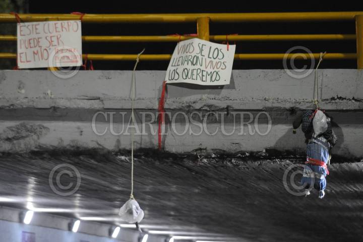 MÉXICO D.F., 23OCTUBRE2014.- Dos maniquíes, fueron colgados con cartulinas en el bajo puente de Churubusco, a su cruce con calzada de Tlalpan en Coyoacán. Al parecer, una pareja de estudiantes que se encontraba en el lugar los responsables de este acto. Policías de este perímetro, acudieron al lugar para retirar dichos objetos y las cartulinas con mensajes referentes a la situación en Ayotzinapa Guerrero. FOTO: LUIS CARBAYO /CUATOSCURO.COM
