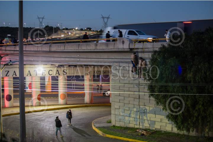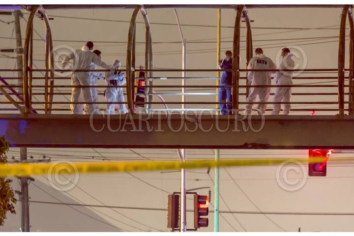 CIUDAD JUÁREZ, CHIHUAHUA, 13JUNIO2025.- Criminalística acordonó la zona luego de que dos hombres fueron localizados colgados en un puente de la carretera Panamericana, a la altura del entronque con el libramiento hacia Santa Teresa y Tornillo, en Ciudad Juárez. Uno de ellos estaba desnudo y ambos presentaban huellas de violencia. En el lugar fue abandonada una camioneta Dodge Nitro con varios galones de gasolina y una cartulina con el mensaje: “Por huachicoleros, aquí están tus cristaleros”. FOTO: MANUEL SÁNCHEZ/CUARTOSCURO.COM FOTO: MANUEL SÁNCHEZ/CUARTOSCURO.COM