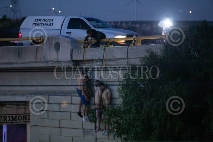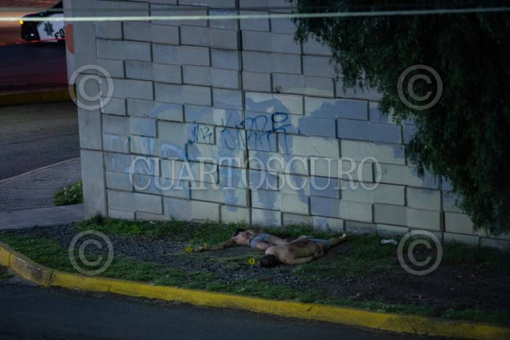 CIUDAD JUÁREZ, CHIHUAHUA, 13JUNIO2025.- Dos hombres fueron localizados colgados en un puente de la carretera Panamericana, a la altura del entronque con el libramiento hacia Santa Teresa y Tornillo, en Ciudad Juárez. Uno de ellos estaba desnudo y ambos presentaban huellas de violencia. En el lugar fue abandonada una camioneta Dodge Nitro con varios galones de gasolina y una cartulina con el mensaje: “Por huachicoleros, aquí están tus cristaleros”. FOTO: MANUEL SÁNCHEZ/CUARTOSCURO.COM FOTO: MANUEL SÁNCHEZ/CUARTOSCURO.COM