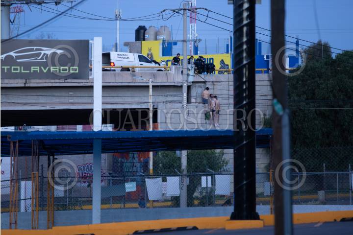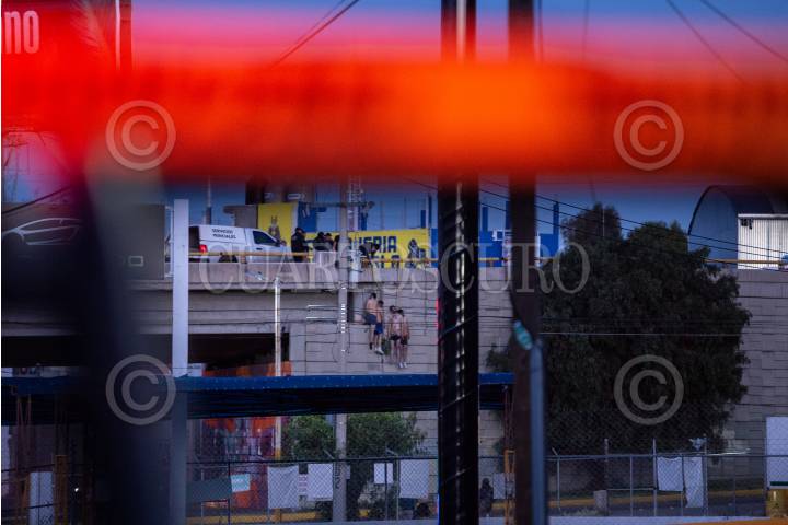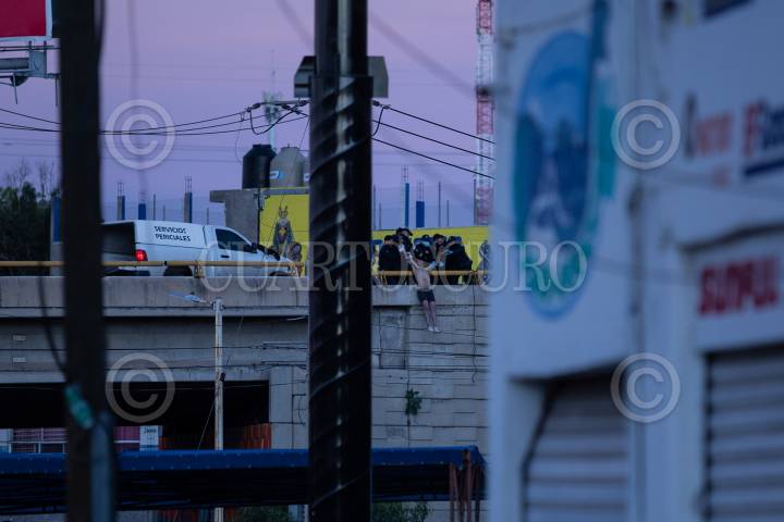 CIUDAD JUÁREZ, CHIHUAHUA, 13JUNIO2025.- Acordonan la zona luego de que dos hombres fueron localizados colgados en un puente de la carretera Panamericana, a la altura del entronque con el libramiento hacia Santa Teresa y Tornillo, en Ciudad Juárez. Uno de ellos estaba desnudo y ambos presentaban huellas de violencia. En el lugar fue abandonada una camioneta Dodge Nitro con varios galones de gasolina y una cartulina con el mensaje: “Por huachicoleros, aquí están tus cristaleros”. FOTO: MANUEL SÁNCHEZ/CUARTOSCURO.COM FOTO: MANUEL SÁNCHEZ/CUARTOSCURO.COM