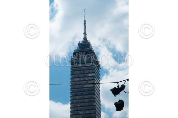 CIUDAD DE MÉXICO, 19NOVIEMBRE2017.- Zapatos colgando en la alameda central, de fondo la Torre Latinoamericana. Desde hace años en varias partes del mundo se ha impuesto una leyenda: la de colgar tenis o calzado deportivo, de los cables de luz. En cuanto al significado de esta práctica, se dice que donde hay tenis colgados en los cables es porque cerca hay un lugar donde se vende droga, otras opiniones dicen que se trata de una forma de marcar territorio de las pandillas o grupos. FOTO: ANDREA MURCIA /CUARTOSCURO.COM