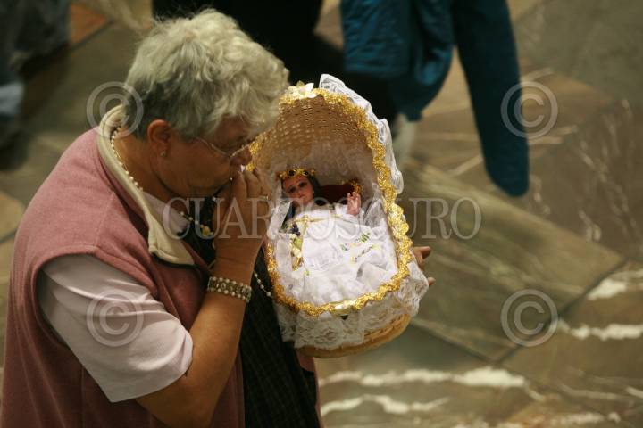 MÉXICO, D.F., 02FEBRERO2009.- Una señora besa a su niño dios en una estación del metro ya que el día de hoy se celebra el día de la Candelaria, que es según la tradición religiosa es el día de la Purificación de María, después de la cuarentena de su parto, y la Presentación del Niño Jesús en el templo Aquellos a los que les tocó el muñeco de la Rosca de Reyes, son los que deberán presentar al Niño Dios en el templo. Para esto, hay que vestirlo el primer año de bebé, el segundo de hombre y el tercero de rey y se le coloca en un pequeño trono. FOTO: SÁSHENKA GUTIÉRREZ/CUARTOSCURO.COM