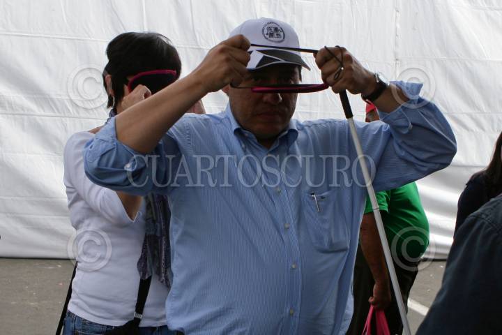 MÉXICO D.F., 06DICIEMBRE2009.- Luis Gonzalez Plascencia, presidente de la Comisión de Derechos Humanos se coloca un antifaz para cubrirse los ojos durante una demostración para conocer más sobre como viven diariamente en la ciudad los invidentes durante la Octava Feria de los Derechos Humanos que se realiza a un costado del Zócalo y en donde también se realizan diversas actividades para para niños, jóvenes y adultos. FOTO: RODOLFO ANGULO/CUARTOSCURO.COM