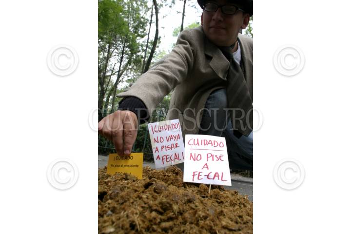 MÉXICO D.F. 08SEPTIEMBRE2006.- Un sipatizante del excandidato ala presidencia Andrés Manuel López Obrador, coloca un letrero en escremento de caballo, con la leyenda "Cuidado no Vaya a Pisar al Presidente" durante un mitin en apoyo a su excandidato en el Hemiciclo a Benito Juárez. FOTO: GUILLERMO PEREA/CUARTOSCURO.COM
