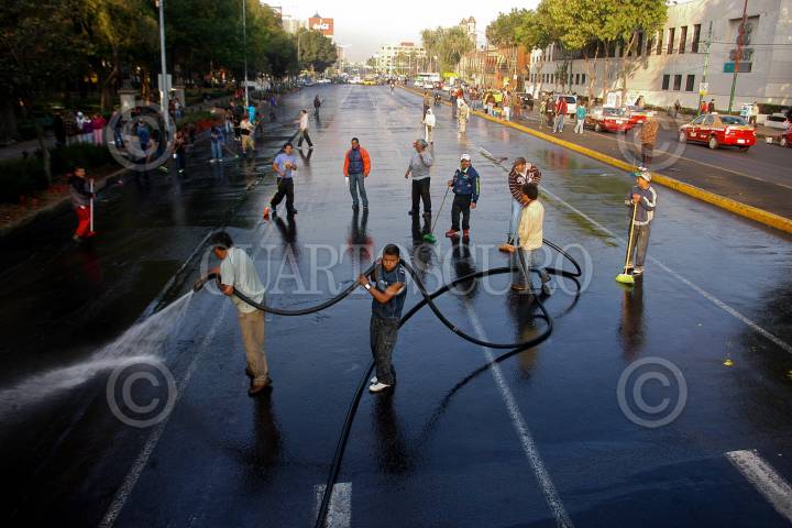 MÉXICO, D.F., 07ENERO2010.- Integrantes de Comercio de la Romería de fiestas de fin de año, realizaron labores de limpieza en la zona de la Alameda Central donde estuvieron colocados los Puestos de Reyes Magos, Santa Claus y la feria que fue retirada este 6 de Enero FOTO: LUIS CARBAYO/CUARTOSCURO.COM