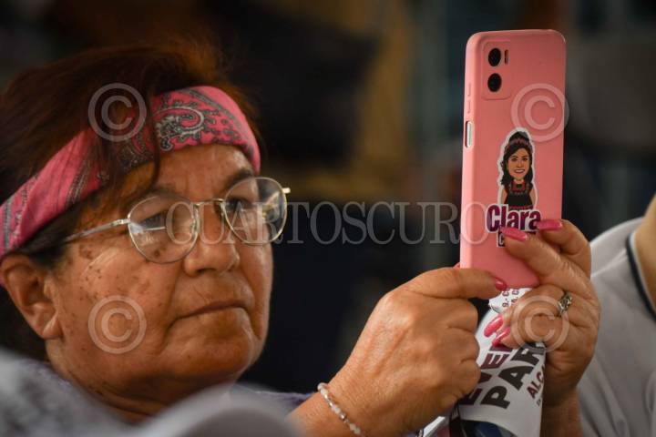 CIUDAD DE MÉXICO, 18ABRIL2024.- Una mujer, graba con su celular la asamblea informativa de Clara Brugada, candidata a la Jefatura de Gobierno por la coalición Sigamos Haciendo Historia, realizada en la Plaza Cívica Recreativa Benita Galeana. FOTO: MARIO JASSO/CUARTOSCURO.COM
