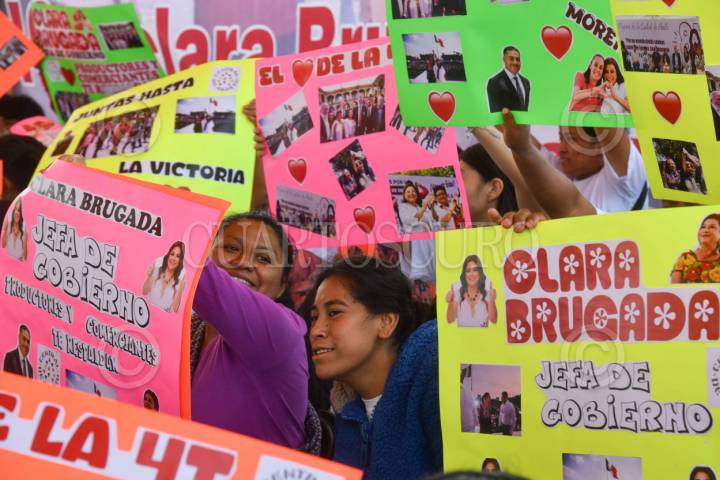 CIUDAD DE MÉXICO, 19ABRIL2024.- Simpatizantes muestran cartulinas a favor de Clara Brugada, candidata a la Jefatura de Gobierno por la coalición Sigamos Haciendo Historia, quién encabezó una asamblea informativa en las inmediaciones de la Central de Abastos para compartir con comerciantes sus propuestas de gobierno. FOTO: MARIO JASSO/CUARTOSCURO.COM