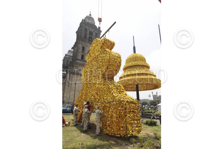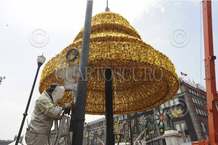 MÉXICO, D.F., 24AGOSTO2011.- Trabajadores del gobierno local trabajan arduamente en la colocación de adornos alusivos a las fiestas patrias que se festejarán en el mes de septiembre en el Zócalo capitalino. FOTO: MOISÉS PABLO/CUARTOSCURO.COM