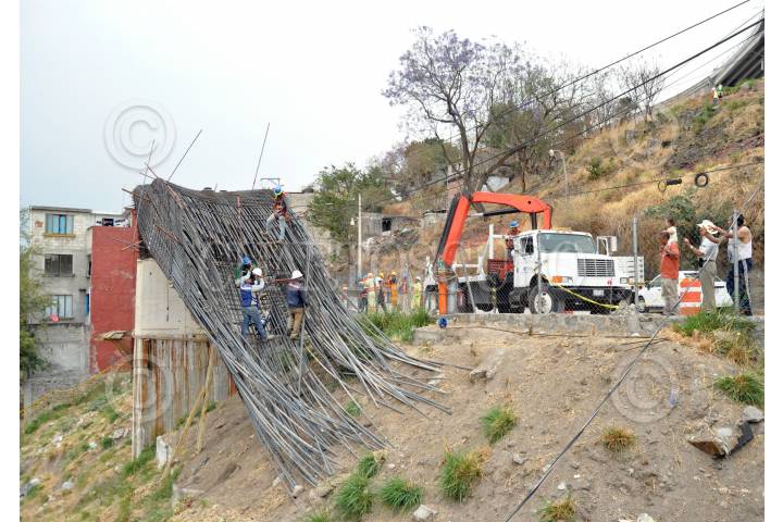 CUERNAVACA, MORELOS, 07MARZO2018.- Una columna de varillas que se levanta para sostener el puente Apatlaco se vino abajo, quedando atrapados dos trabajadores entre la estructura, los cuales fueron rescatados y trasladados al hospital para atender sus heridas. Presuntamente la caída se debió a los fuertes vientos y lluvia que durante esta tarde afectaron a la capital. La obra se encuentra en el sitio conocido como el Polvorín, al sur de la capital. FOTO: ESPECIAL /CUARTOSCURO.COM