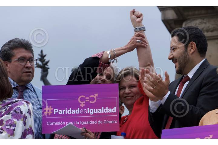 CIUDAD DE MÉXICO, 17JUNIO2019.- Martha Lucía Micher Camarena, Senadora del Congreso de la Unión; Ricardo Monreal, Senador del Congreso de la Unión; Nadine Gasman, Presidenta del Instituto Nacional de las Mujeres y Martí Batres, Presidente del Senado de México, encabezaron el encendido de la Columna de Independencia, en tonos morados alusivo a la celebración de la paridad constitucional que se aprobó de manera unánime. FOTO: ROGELIO MORALES /CUARTOSCURO.COM