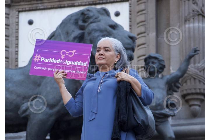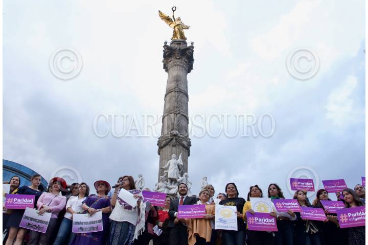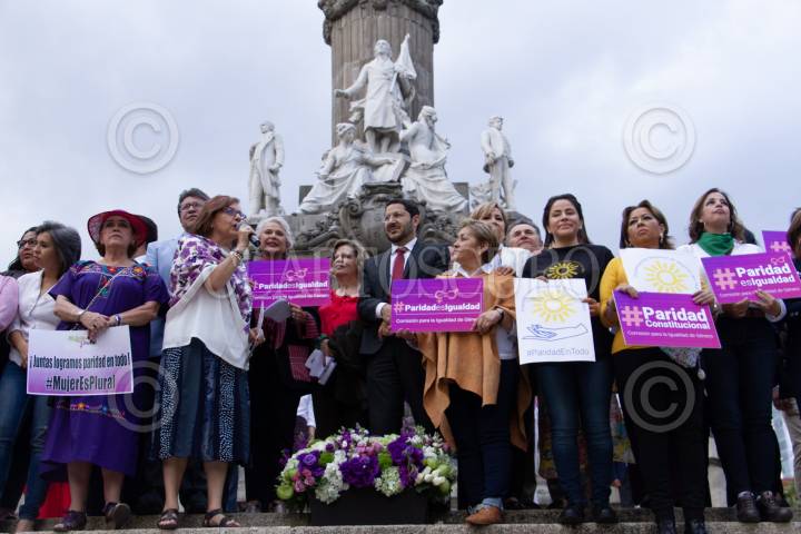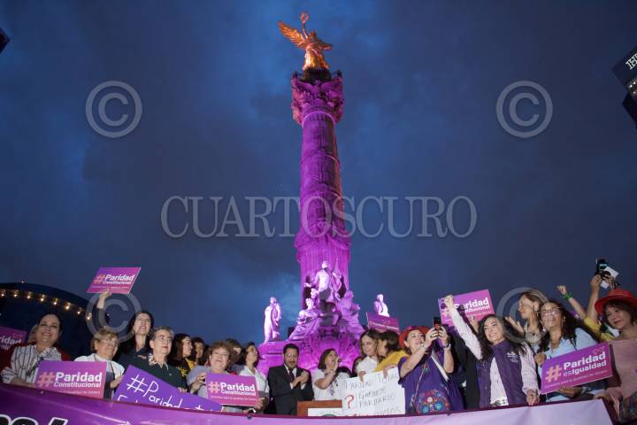 CIUDAD DE MÉXICO, 17JUNIO2019.- La tarde de este lunes se llevó acabo una ceremonia en la explanada de la Columna de Independencia, esto debido a la celebración de la paridad constitucional que se aprobó de manera unánime en las cámaras, posteriormente a la ceremonia el Ángel de la Independencia se vio iluminado con tonos morados. FOTO: ROGELIO MORALES /CUARTOSCURO.COM