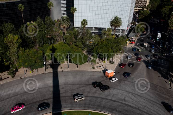 Vista desde la cima de la columna del Ángel de la Independencia donde la sombra del monumento se dibuja sobre el arroyo vehicular.