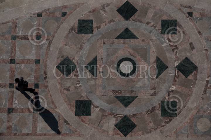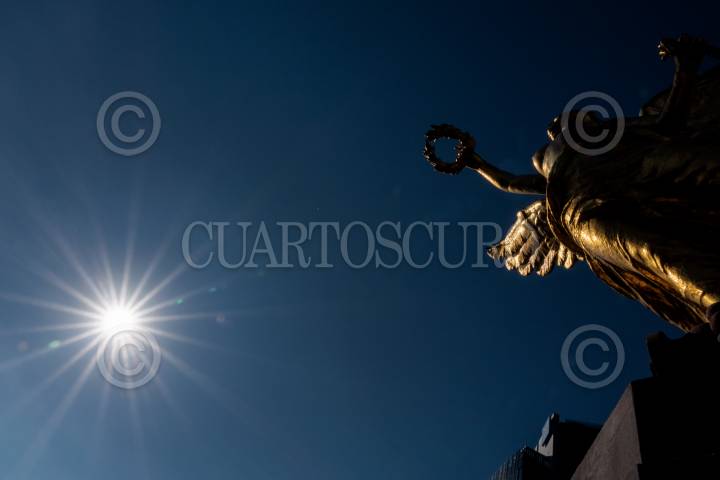 Vista desde la cima de la columna del Ángel de la Independencia donde se observa la sombra de un transeúnte sobre la base de la columna