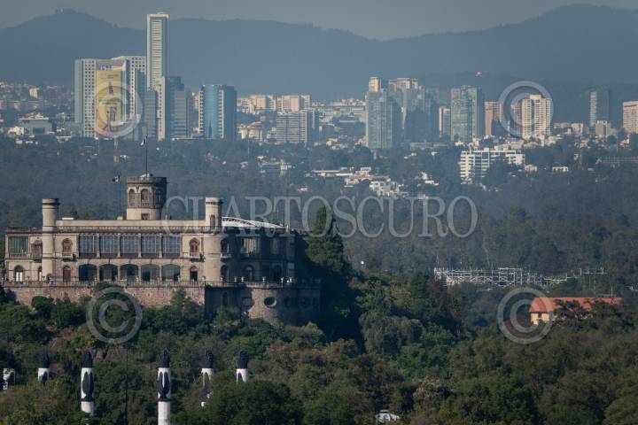 Vista desde la cima de la columna del Ángel de la Independencia donde lse observa el Castillo de Chapultepec y el Poniente de la capital.