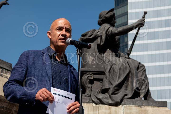 Jesús Esteva Medina durante la conferencia a medios sobre los trabajos realizados al Ángel de la Independenica.