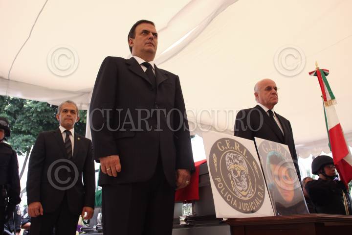 MÉXICO, D.F., 04JULIO2009.- Miguel Ángel Mancera, Procurador General de Justicia del DF, Marcelo Ebrard Casaubón, Jefe de Gobierno y Meyer Klip, presidente del Consejo Ciudadano de Seguridad Pública, encabezaron un homenaje de cuerpo presentes de los comandantes del GERI, Carlos Julio Rincón Juárez y José Antonio Moreno Sánchez, en instalaciones de la procuraduría. FOTO: MOISÉS PABLO/ CUARTOSCURO.COM