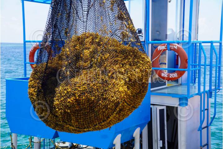 PUERTO MORELOS, QUINTANA ROO, 16 DE JULIO DE 2025.– El buque interoceánico NATAN de la Secretaría de Marina, al mando del contraalmirante Topiltzin Flores Jaramillo, realiza labores de recolección de sargazo en altamar. La embarcación opera con una red especializada para capturar la macroalga antes de su arribo a la costa de Puerto Morelos. FOTO: ELIZABETH RUIZ / CUARTOSCURO.COM