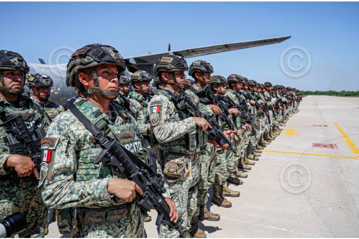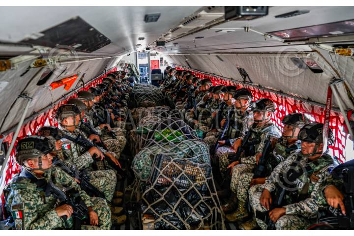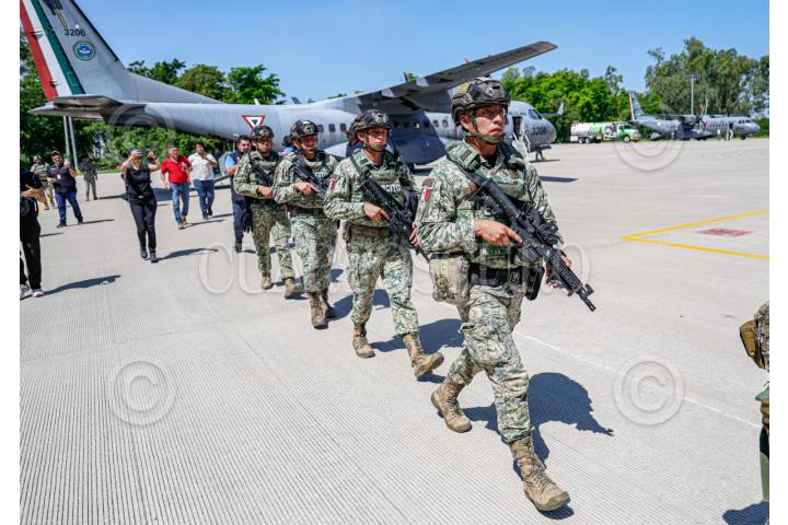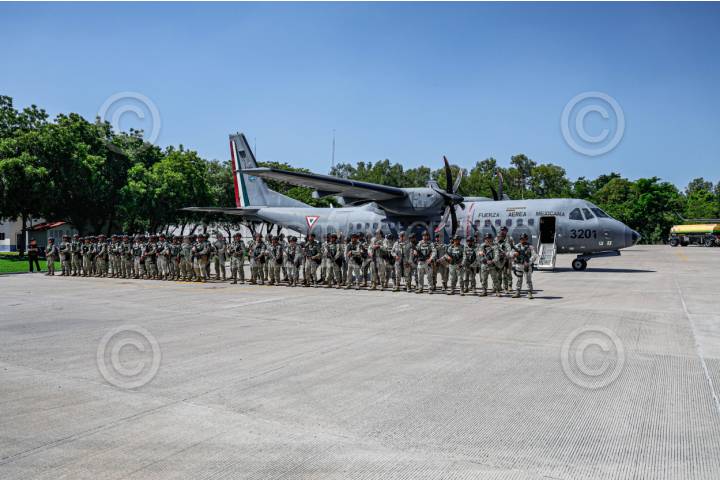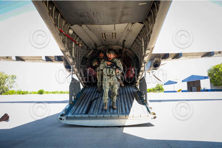 CULIACÁN, SINALOA, 23JULIO2025.- Arriban a Culiacán 150 Elementos de la Brigada de Fusileros Paracaidistas fue esta mañana que aterrizaron 4 aeronaves procedentes del centro del país en la Base Aérea No. 10, con este despliegue suman ya 300 elementos de fuerzas especiales que en menos de 48 horas han llegado a Culiacán. La llegada de los nuevos contingentes militares a Culiacán responde directamente a las instrucciones giradas por la presidenta Claudia Sheinbaum durante su visita oficial del pasado 11 de julio, en la que refrendó el compromiso federal de reforzar la seguridad en Sinaloa. Esta acción también se alinea con el anuncio realizado por el secretario de Seguridad y Protección Ciudadana, Omar García Harfuch, quien el domingo 20 de julio encabezó la conferencia del Gabinete de Seguridad en la Base Aérea Militar No. 10, donde confirmó que el despliegue de fuerzas especiales será constante y estratégico, como parte de una política de presencia quincenal en la entidad para contener la violencia y recuperar la paz en zonas prioritarias. FOTO: JOSÉ BETANZOS ZÁRATE/CUARTOSCURO.COM