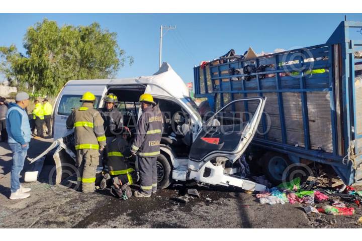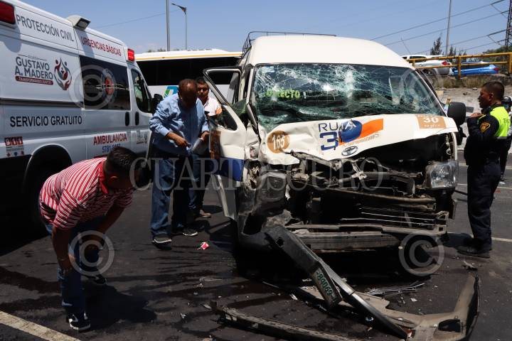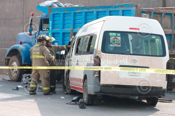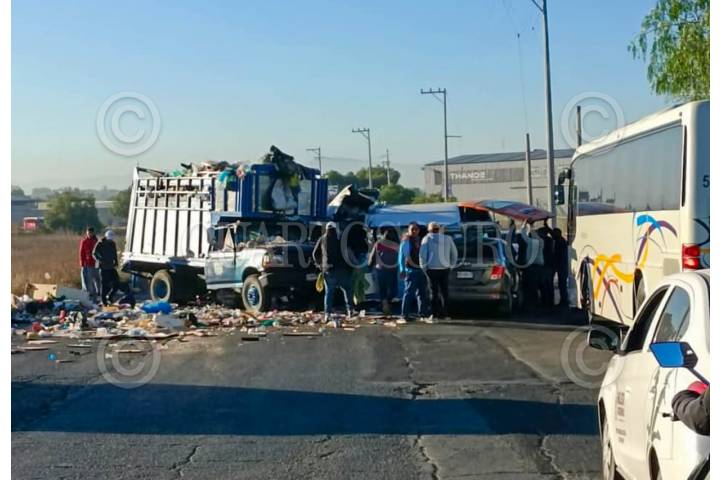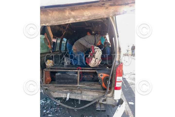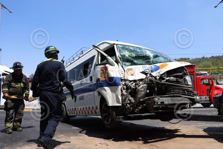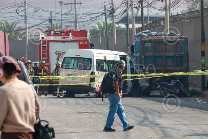 TECAMAC, ESTADO DE MÉXICO, 14ABRIL2025.- Al menos 5 muertos y 16 lesionados fue el saldo de un choque entre una unidad del transporte público de pasajeros, un camión recolector de basura y un automóvil particular en la carretera libre a Tizayuca, en la comunidad de Los Reyes Acozac en Tecámac. Los hechos ocurrieron la mañana de este lunes en el entronque de la carretera libre a Tizayuca, en la esquina de Paseo Bicentenario. En el lugar una combi de pasajeros de la Ruta Servicio Expreso con placa A-77011-D y con número económico CB013, que se dirigía hacia le centro de Tecámac, se impactó de frente con la camioneta de basura con placas KY-84-013 y posteriormente el automóvil chocó por detrás. FOTO: CUARTOSCURO.COM