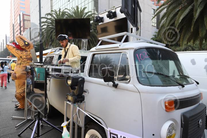 Un DJ ameniza el evento en una combi modificada a modo de tornamesas durante el evento por el Día mundial de la Combi en el Monumento a la Revolución.