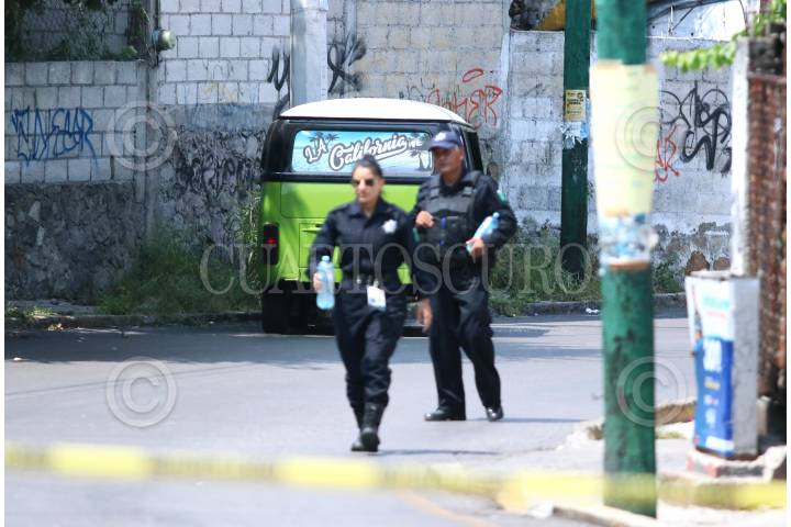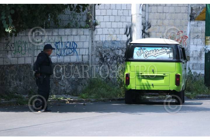 CUERNAVACA, MORELOS, 30SEPTIEMBRE2023.- Un policía municipal vigila una escena de crimen donde un hombre que se encontraba en su combi fue asesinado a tiros. El hecho ocurrió pasado el mediodía en la calle Mariano Matamoros de la colonia Lagunilla, donde un hombre que estaba dentro una combi color verde con toldo gris fue atacado a balazos quedando en el asiento de copiloto. Un policía municipal impidió al fotógrafo realizar su trabajo y con intimidaciones fue retirado del sitio. FOTO: MARGARITO PÉREZ RETANA / CUARTOSCURO.COM