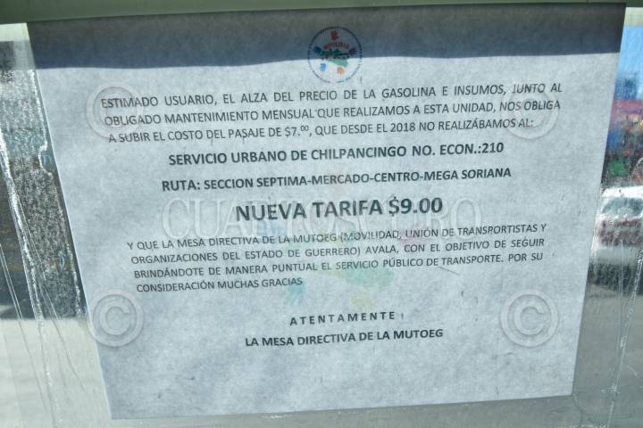 De manera arbitraria, la Mesa Directiva de Movilidad, Unión de Transportistas y Organizaciones del Estado de Guerrero (Mutoeg), incrementron el costo del pasaje en el servicio del transporte público, tipo urvan, de siete a nueve pesos en Chilpancingo