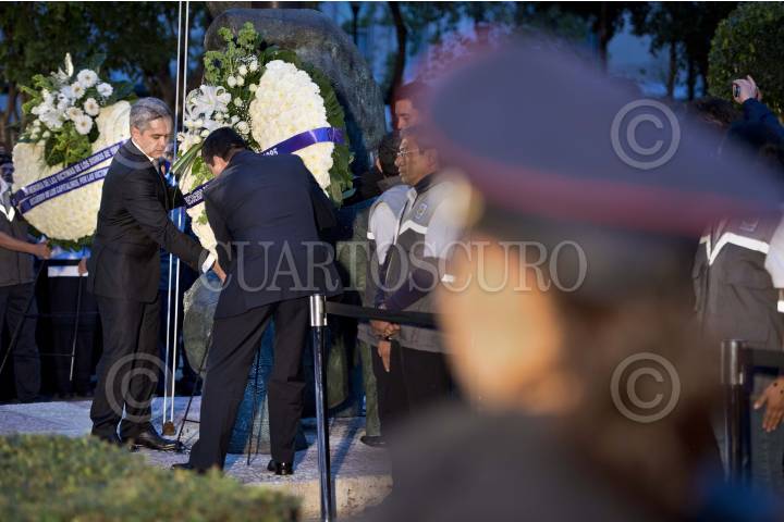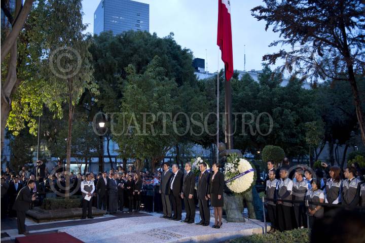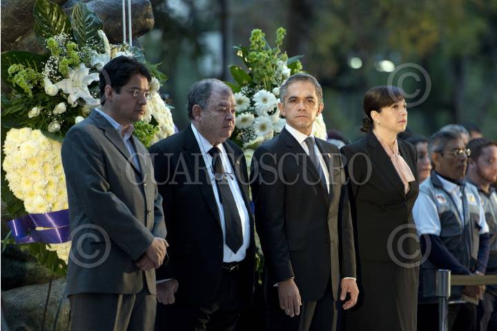 MÉXICO, D.F., 19SEPTIEMBRE2013.- Miguel Ángel Mancera, Jefe de Gobierno del Distrito Federal; encabezó la ceremonia cívica solemne conmemorativa al 28 aniversario de los sismos de 1985; acompañado del presidente del Tribunal Superior de Justicia del Distrito Federal (TSJDF) y el Jefe delegacional en Cuauhtémoc, montaron una guardia de honor en la Plaza Solidaridad en el Centro de la Ciudad de México. FOTO: MISAEL VALTIERRA / CUARTOSCURO.CO