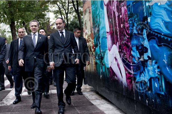 MÉXICO, D.F., 19SEPTIEMBRE2013.- Miguel Ángel Mancera, Jefe de Gobierno del Distrito Federal; camina a su vehículo mientras platica con personal de su equipo de trabajo después de haber concluído la ceremonia cívica conmemorativa al 28 aniversario de los sismos de 1985, realizada en la Plaza Solidaridad en el Centro de la Ciudad de México. FOTO: MISAEL VALTIERRA / CUARTOSCURO.CO