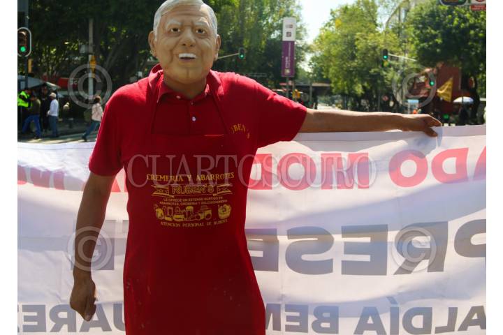 CIUDAD DE MÉXICO. 30JULIO2025.- Comerciantes de mercados de la alcaldía Benito Juárez, realizaron un bloqueo de las avenidas, Cuauhtémoc y Xola al final llegaron a un acuerdo. En la imagen uno de los manifestantes usa una mascara del expresidente Andrés Manuel López Obrador. FOTO: VICTORIA VALTIERRA/CUARTOSCURO.COM