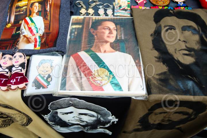CIUDAD DE MÉXICO. 18AGOSTO2025.- Venta de todo de souvenirs, del ex presidente AMLO y de la ahora Presidenta Claudia Sheinbaum en puestos ambulantes del primer cuadro de la ciudad. FOTO: VICTORIA VALTIERRA/CUARTOSCURO.COM