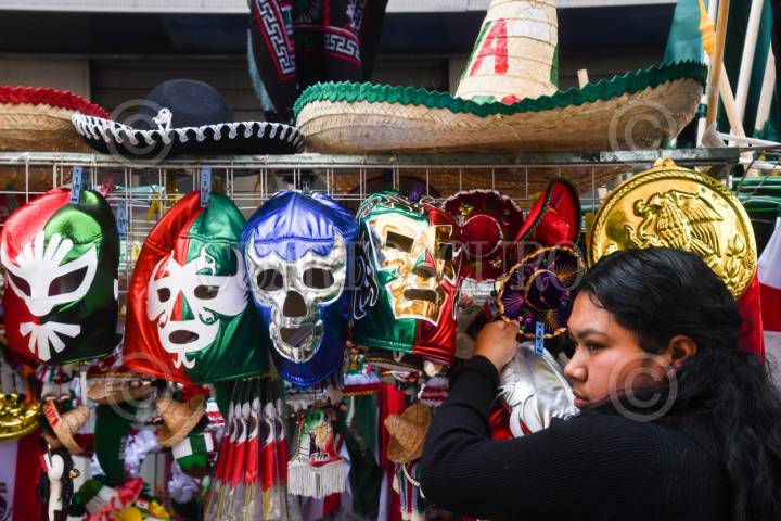 CIUDAD DE MÉXICO, 05SEPTIEMBRE2025.- Una mujer acomoda máscaras de lucha libre en un comercio de artículos para las fiestas patrias. FOTO: MARIO JASSO/CUARTOSCURO.COM