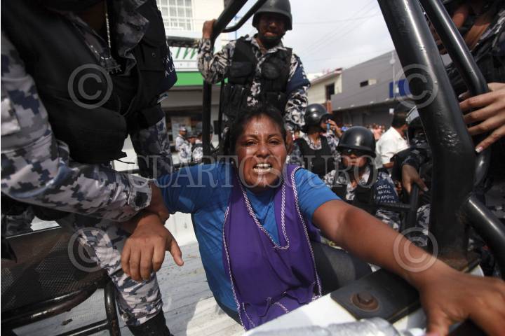 VERACRUZ, VERACRUZ, 10JUNIO2014.- Elementos antimotines de la Secretaría de Seguridad Pública y uniformados de la Policía Naval se enfrentaron contra un grupo de vendedores informales instalados en la conocida "zona cero" del área de mercados de esta ciudad. El conflicto se originó después de que los gendarmes trataron de desalojarlos del lugar. El saldo de la gresca fue de cinco personas detenidas con uso excesivo de la fuerza, entre ellas tres mujeres y un menor de edad. FOTO: FÉLIX MÁRQUEZ /CUARTOSCURO.COM