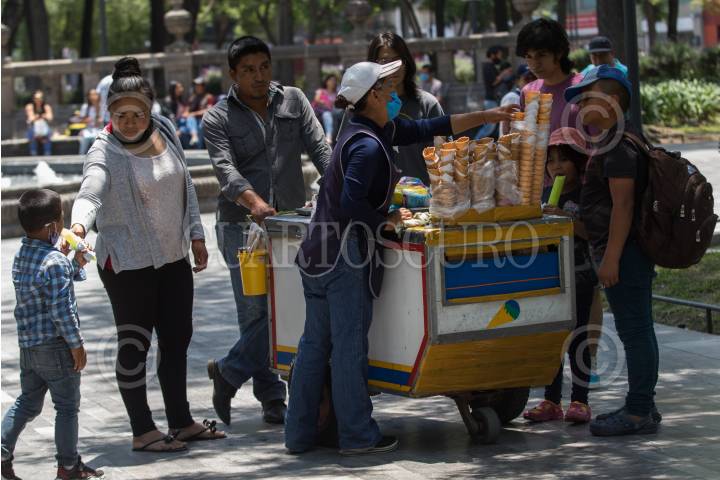 Familias compran chicharrones y helados en la Alameda en el último fin de semana antes de que inicien las clases virtuales el día de mañana.