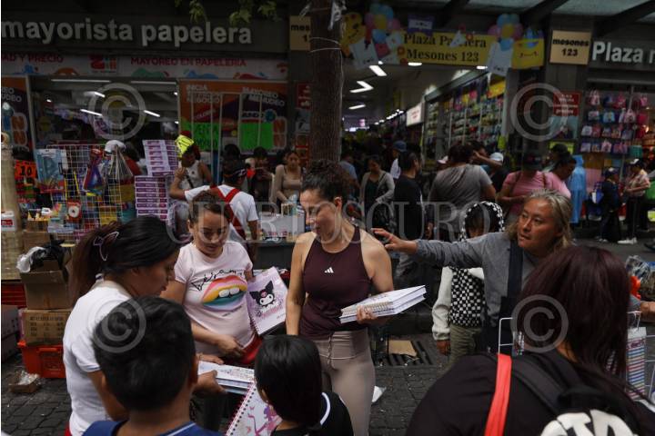 CIUDAD DE MÉXICO, 31AGOSTO2025.- Vendedores de útiles escolares en la calle de Mesones en el Centro Histórico realizan venta a padres de familia en el último día de vacaciones de verano. FOTO: GRACIELA LÓPEZ/CUARTOSCURO.COM