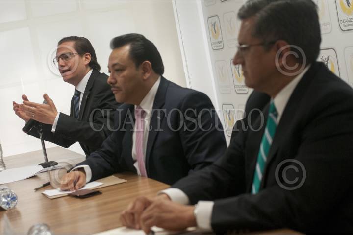MÉXICO, D.F., 07FEBRERO2014.- Salomón Chertorivski, secretario de Desarrollo Económico, Héctor Serrano, secretario de Gobierno, y Joel Ortega, director general del Sistema de Transporte Colectivo (STC), durante la conferencia para anunciar el programa para la integración a la Economía Formal de los Comerciantes al Interior del Sistema Colectivo Metro. FOTO: DIEGO SIMÓN SÁNCHEZ /CUARTOSCURO.COM